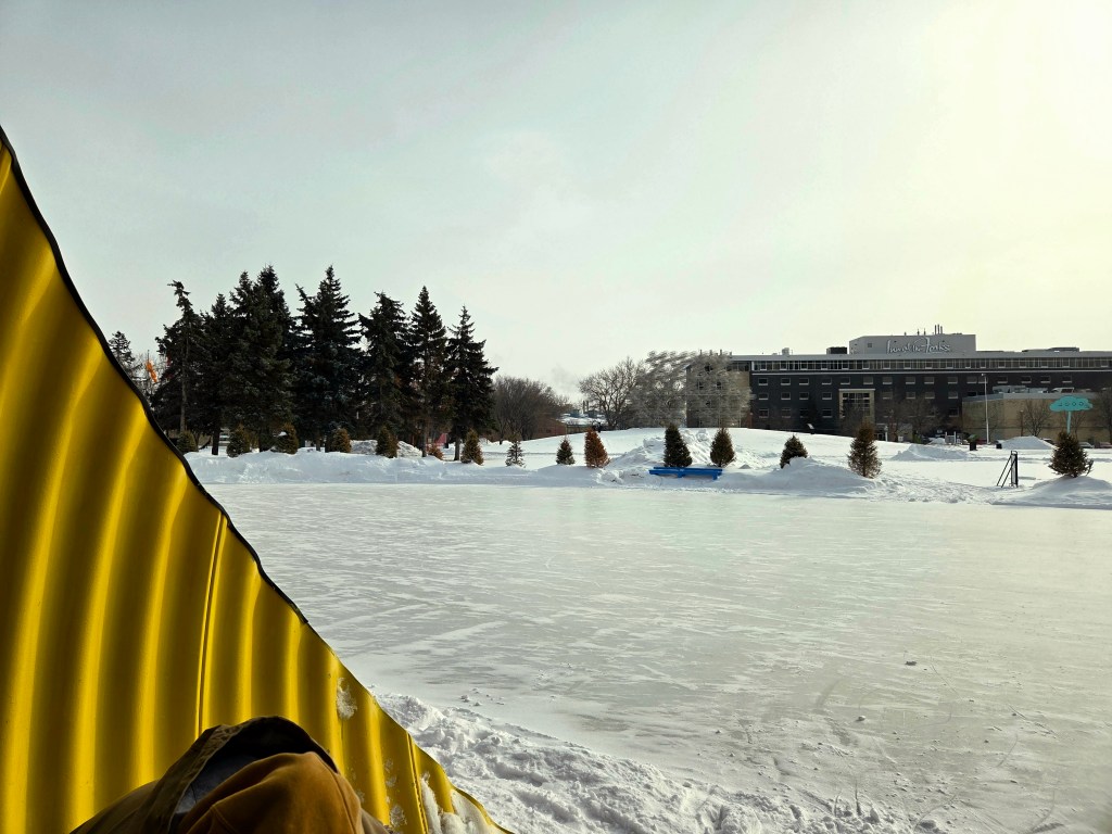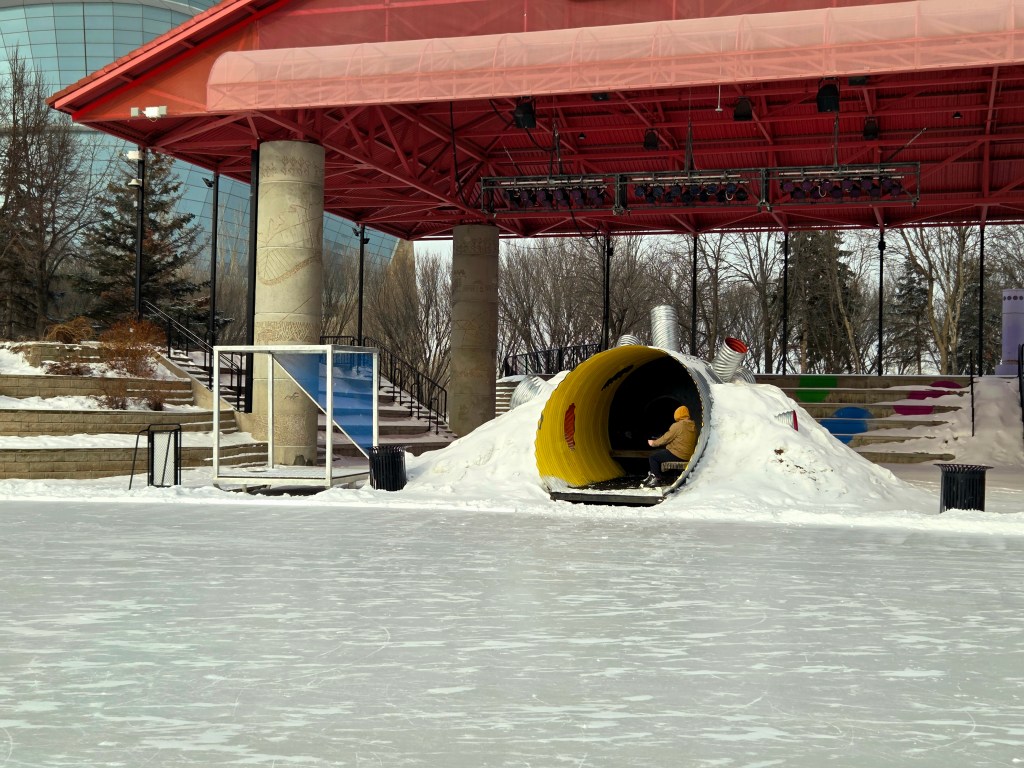 At The Forks, there are two paths you can choose when skating. If you go up the stairs, you will find a tunnel of lights that is especially beautiful at night time. After the lights you’ll skate your way down to path until you get to an open area to free skate. This is called the Upper Trails, and they lead you to the “Rink at CN Stage.”