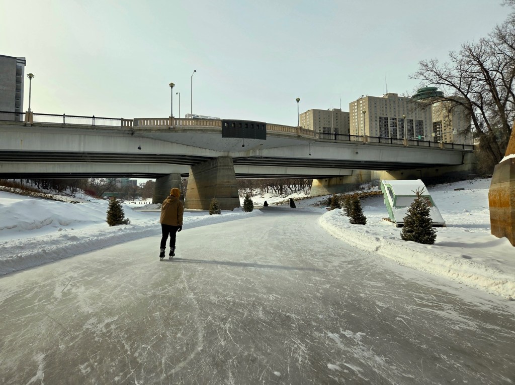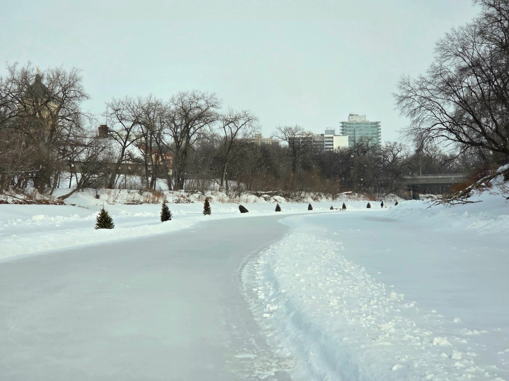 The second path takes you along the Assiniboine/Red River. This is called the Nestaweya River Trail. Every year, the length of this trail depends on the weather. The colder it gets, the more the rivers freeze, and the bigger a trail is cleared and smoothed for people to skate on. As of today, all sections of the trail are open to skate and walk on.