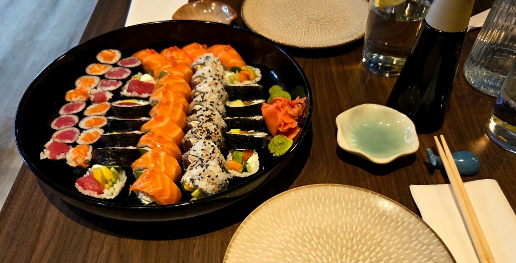 The sets come with a variety of different sushi and at least 40 pieces. We went with the raw fish set, consisting of different tuna and salmon rolls., as well as some nigiri.